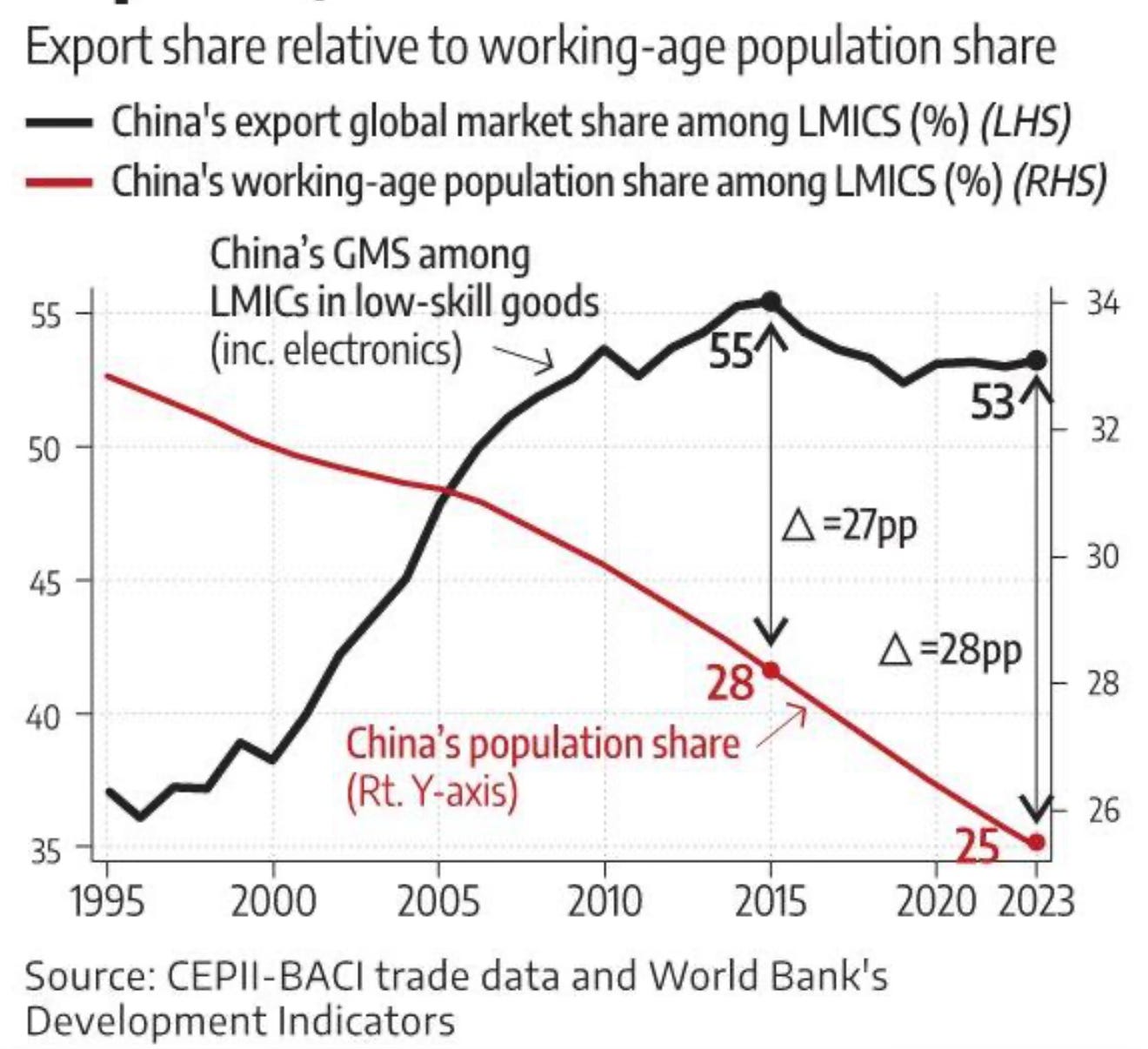 Today, China’s manufacturing trade surplus stands at roughly $2 trillion, about $1.4 trillion of which comes from low-skill goods… Chinese imports still account for about 1.5 per cent of the West’s gross domestic product (GDP)… Accounting for almost 4 per cent of LMICs’ combined GDP, the import shock from China represents a larger (and growing) share of their economies than imports of high-skill goods do in developed countries… compare China’s share of low-skill exports among LMICs to its share of the global workforce… The wedge between China’s export share and its labour-force share — roughly 28 percentage points — suggests that China continues to occupy “excess” export space that could otherwise support tens of millions of manufacturing jobs in poorer economies.