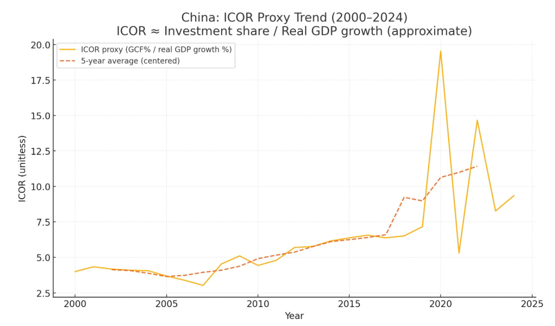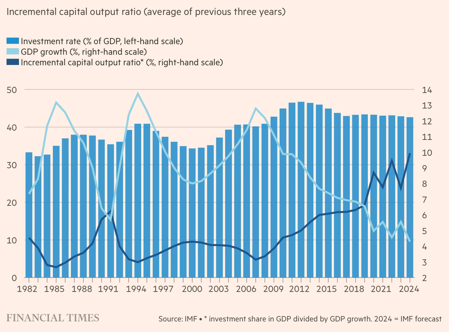 I have blogged here pointing to China’s sharply rising incremental capital output ratio (ICOR). Even as investment has been range-bound at 43-45% of GDP since before the global financial crisis, the ICOR has nearly tripled from below 3.5 to touch 10. This period has also coincided with economic growth declining precipitously from above 12% to just 4%. As the graphic shows, high investments rates brings ever less growth.