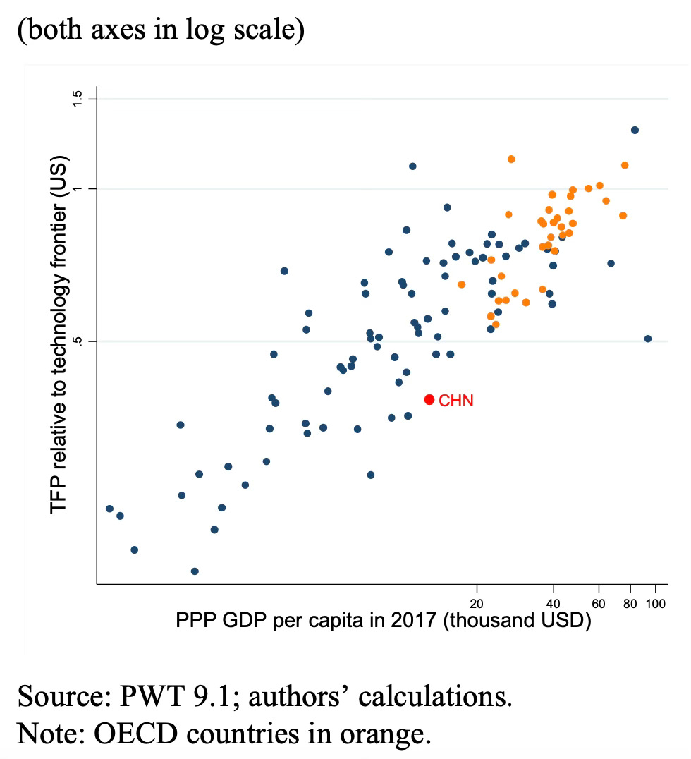 There are at least three hard stops to this model. One is the importance of productivity growth in maintaining reasonable GDP growth in an economy faced with a shrinking labour force, an increasing share of the services sector in the economy, and declining efficiency of investment. An IMF working paper shows that China TFP compared to the technology frontier (US=100) in 2017 lagged even middle-income countries.