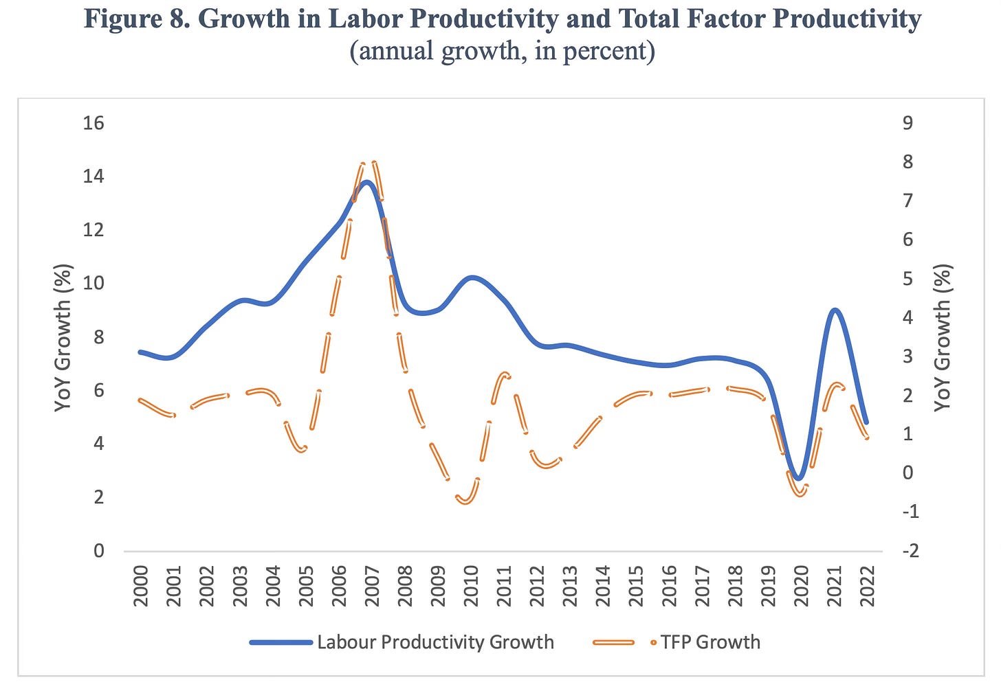 But this leadership in innovation and manufacturing has not translated into productivity growth, where its TFP has slowed down considerably and is now grossly underperforming the East Asian miracle economies.