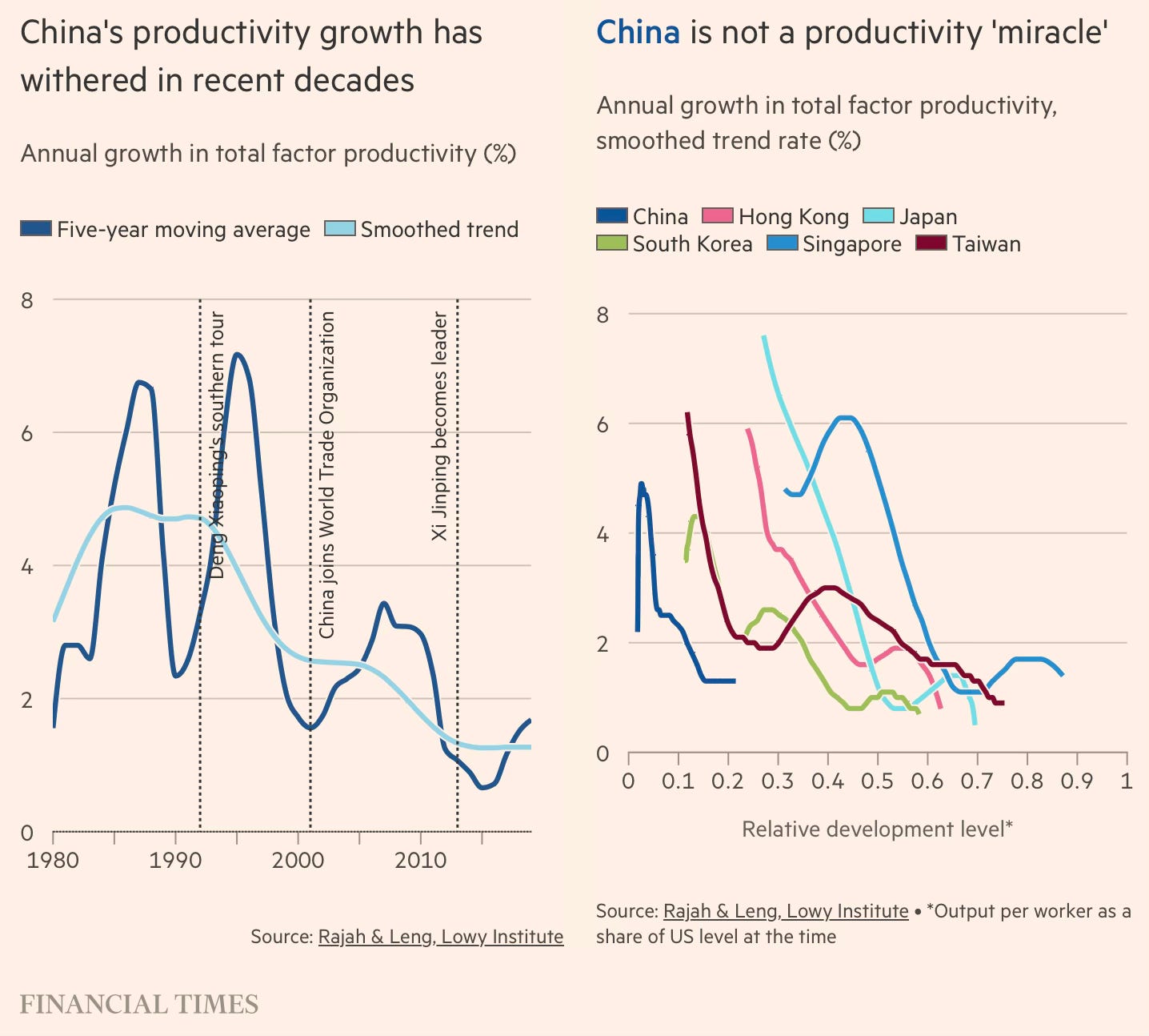 Eswar Prasad has highlighted China’s productivity problem. The country’s TFP growth (RHS) has been stagnant at about 1 per cent over the last decade.