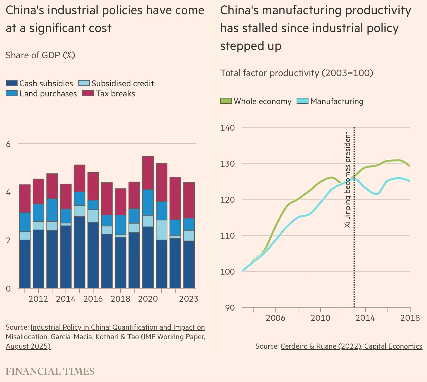 China’s industrial policies may have misallocated resources in a big way, thereby creating excess capacity, deflation, and keeping alive poor performers. IMF economists estimates that these subsidies, estimated at 4.4% of GDP in 2023, may have cut its TFP by 1.2% and GDP by 2%. They have tended to flow to better-connected firms, and raised entry barriers, thereby misallocating both talent and finance.