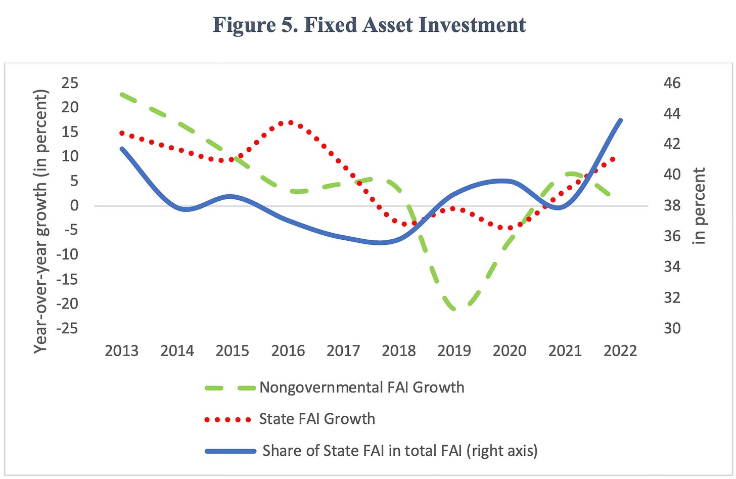 China’s capital to labor ratio is only about 28 percent that of the United States. However, recent investment has been driven by the public (state) sector rather than the nongovernmental sector. In 2022, for instance, state investment amounted to 44 percent of total fixed asset investment, a significant increase relative to the corresponding ratio of about 36 percent during 2017-2018… in China state-owned enterprises, which have collectively received a disproportionate share of bank credit, have typically not generated strong returns on those investments. The recent collapse in nongovernmental investment growth, with state investment accounting for nearly all of the growth in overall fixed asset investment in 2022, is a sign that private businesses might be wary of increasing investment when they see the economic and political environments as unfavourable. Moreover, China’s capital to output ratio is in fact about 50 per cent higher than that of the United States. This reflects lower levels of total factor productivity (TFP) and human capital in China relative to the United States. This implies that increasing investment might not be the optimal way to generate growth.