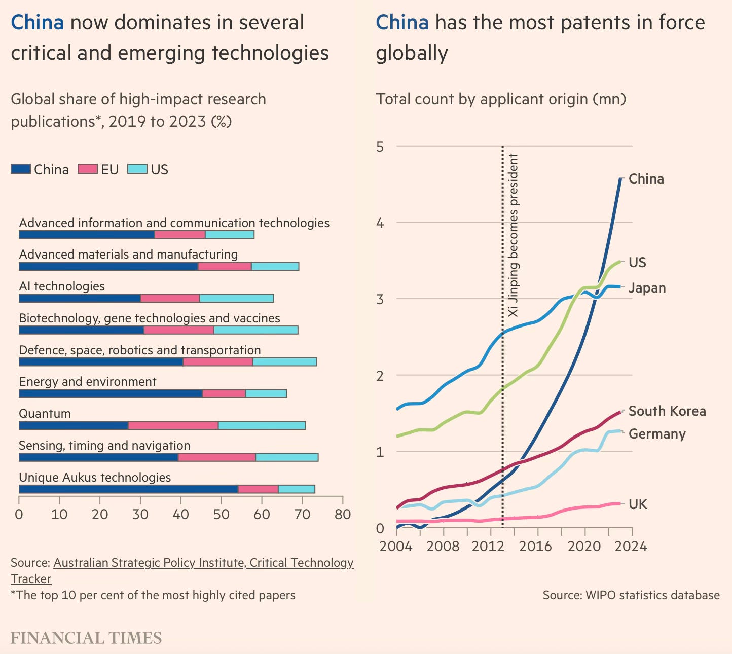 According to the Australian Strategic Policy Institute, China became the global leader in 57 out of 64 critical technologies between 2019-23, up from leadership in just 3 between 2003-07. It leads today not only in manufacturing EVs, batteries, renewables, etc., but has almost caught up with the West on AI, quantum technologies, and biotech.