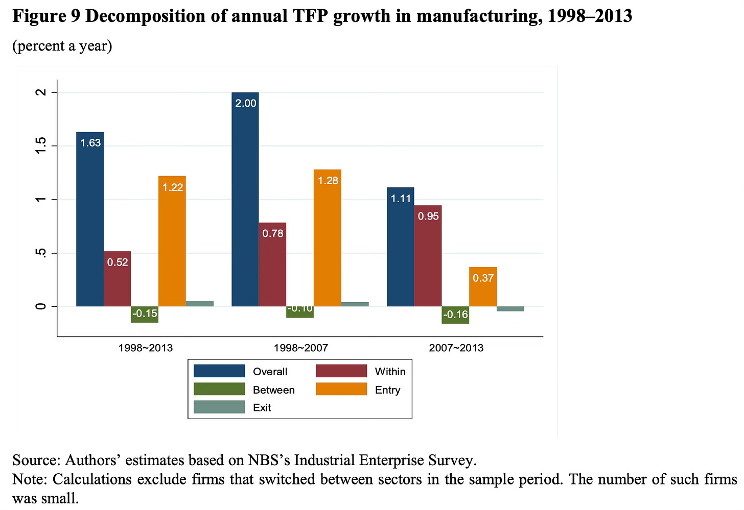 Over 1998–2013, most of the increase in productivity—two-thirds—came from the entry of new firms… The other primary source of growth was improving productivity of incumbents, which contributed 40 percent. Over the entire period, firm exit contributed negligibly to manufacturing productivity growth, reflecting one of several possibilities. Poorly performing firms either did not exit or exited but accounted for only a small percentage of aggregate output. Or the productivity of some firms that exited was average or better. Similarly, there were no gains from reallocating resources (labor, capital, and intermediate inputs) to more productive firms, which would have increased aggregate productivity, all else equal. In fact, the contribution was slightly negative. In advanced countries, this is the most important source of productivity growth, and thus stands out as a possible major source of future productivity growth in China. After 2007, average manufacturing productivity growth in China decreased almost by half. The most important reason for the decline was that the contribution of better entrants disappeared. In some sectors, the contribution of new entrants was actually negative, implying that these firms entered the productivity distribution lower than the sector average.