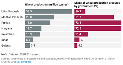 Livemint has a very good data article which points to the large variations in public procurements of wheat across states. In the 2020-21 Rabi season, wheat production soared to 109.2 mt in 2020-21 from 92.3 mt in 2015-16, wheat acreage rose to 34.6 m hectares, 14% more than the average of the last five years, and public procurement rose from 24.9% in 2015-16 to 39.6% in 2020-21. In 2020-21, 73.5% of wheat production in Punjab, the third largest producer, was procured, compared to just 17% in UP, the largest producer.