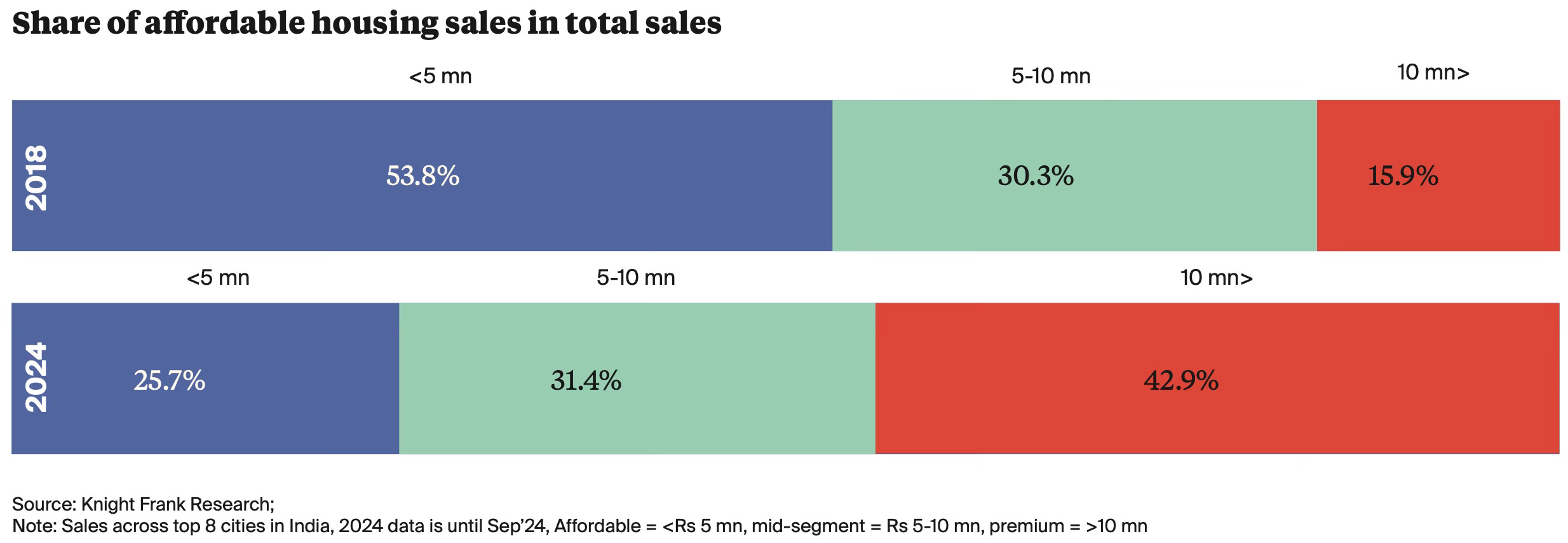 A Knight Frank report finds a sharply declining share of affordable housing in the total housing supply in India, even with affordable housing units defined as those up to Rs 5 million.