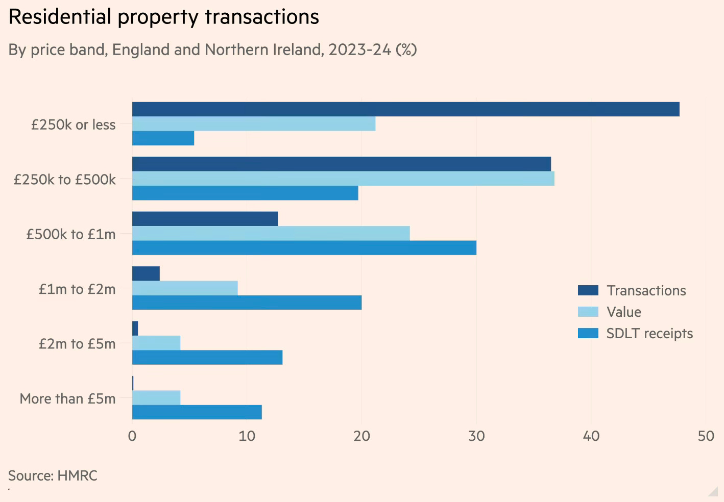 It also shows that while homes priced at £5mn or more might only make up 0.1 per cent of total residential transactions across the country, they account for a far higher proportion of the value of properties transacted (4.2 per cent) and also make up a chunk of the stamp duty collected (11.3 per cent).