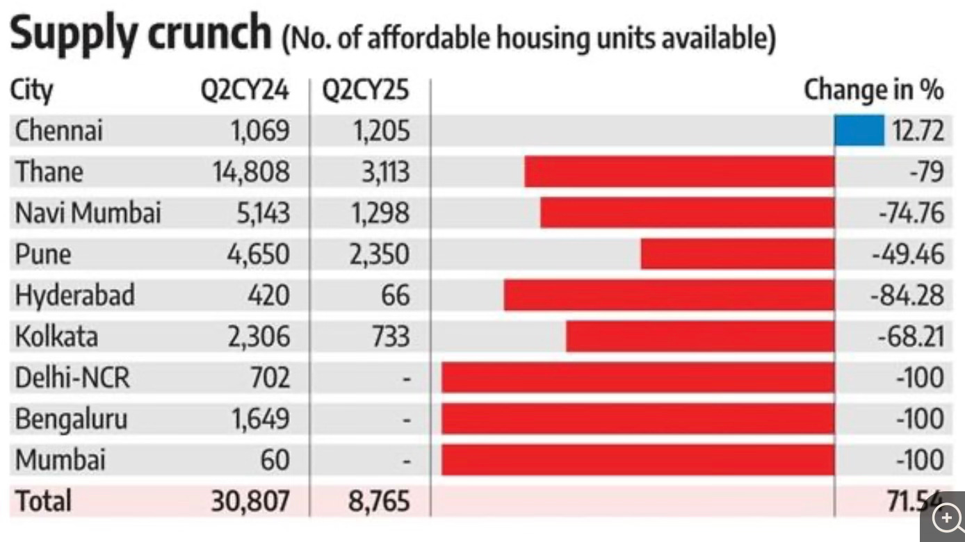 Recently, Mumbai-based Mahindra Lifespace Developers announced its exit from the affordable housing segment by FY28-29… Gurugram-based Signature Global, which started with affordable housing, pivoted to mid-income stock premium housing — ranging between ₹2 crore and ₹4 crore — in the last couple of years, due to rising land prices… According to PropEquity, a listed real estate data analytics firm, in Q2 CY25, there was no affordable housing supply in cities like Mumbai, Delhi NCR, and Bengaluru compared to Q2 CY24. In cities like Navi Mumbai, Thane, Hyderabad, and Kolkata, the supply declined significantly. The affordable supply across the top cities declined by 71.54 per cent year-on-year (Y-o-Y) in Q2 CY25.
