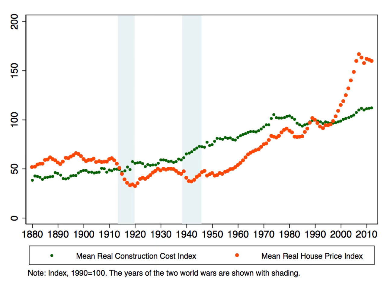 While construction costs have flat-lined in the past decades, sharp increases in residential land prices have driven up international house prices… During the past four decades, construction costs in advanced economies have remained broadly stable, while house prices surged… Our decomposition suggests that about 80 percent of the increase in house prices between 1950 and 2012 can be attributed to land prices. The pronounced increase in residential land prices in recent decades contrasts starkly with the period from the late 19th to the mid-20th century. During this period, residential land prices remained, by and large, constant in advanced economies despite substantial population and income growth…