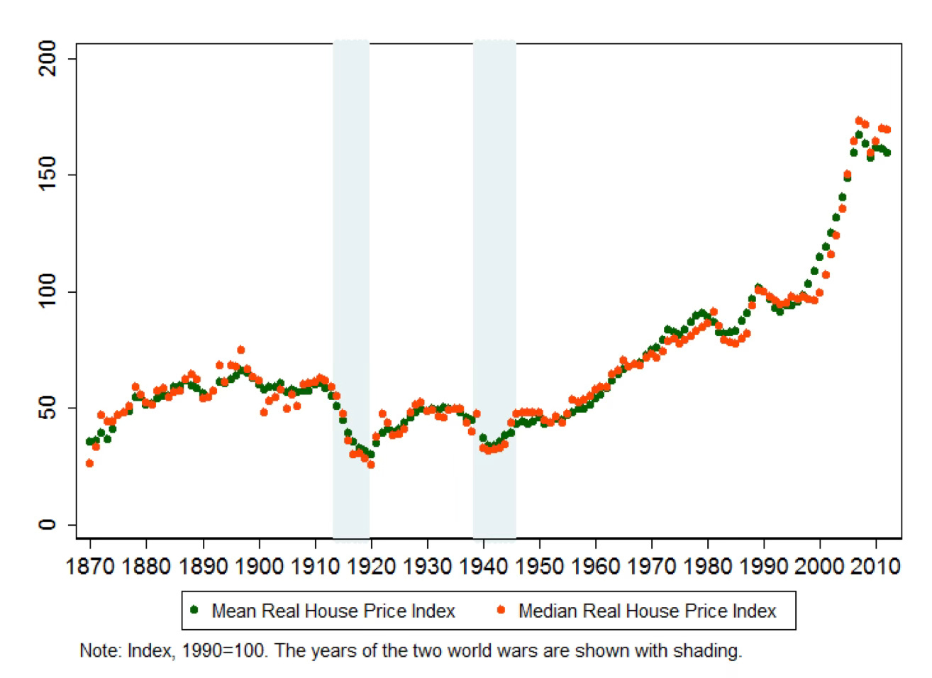 This paper presents annual house price indices for 14 advanced economies since 1870. Based on extensive data collection, we are able to show for the first time that house prices in most industrial economies stayed constant in real terms from the 19th to the mid-20th century, but rose sharply in recent decades… By the 1960s, they were, on average, not much higher than they were on the eve of World War I. They have been on a long and pronounced ascent since then. For our sample, real house prices have approximately tripled since the beginning of the 20th century, with virtually all of the increase occurring in the second half of the 20th century. We also find considerably cross-country heterogeneity. While Australia has seen the strongest, Germany has seen the weakest increase in real house prices in the long-run. Moreover, we demonstrate that urban and rural house prices have, by and large, moved together and that long-run farmland prices exhibit a similar long-run pattern…