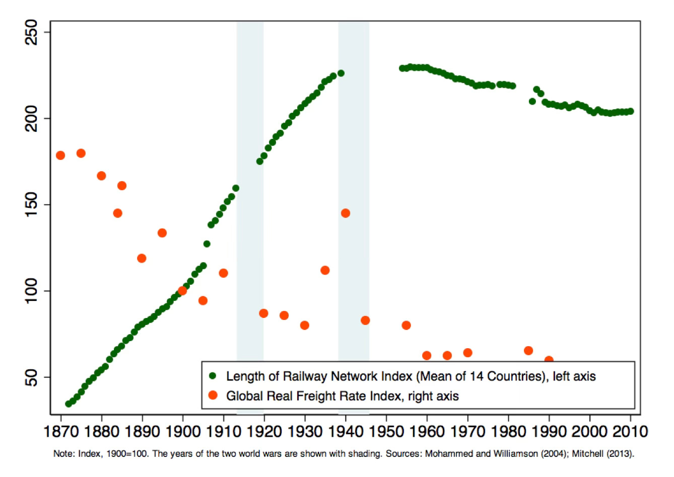 Glaeser and Kohlhase calculate that the average cost of moving a ton a mile was 18.5 cents (in 2001 Dollars) in 1890 but had fallen to 2.3 cents at the beginning of the 2000s… The length of the railway network can serve as a proxy for the opening up of new territories over time. For our 14 countries, the length of the railway network peaked in the interwar period and has not grown materially since then… By 1930, essentially the entire world had been made accessible. Subsequent expansions of the transportation network through highways did not lead to a comparable fall in transportation costs… The dramatic efficiency gains in maritime transportation were also realized in the late 19th and early 20th century. The 19th century revolution in shipping rested on two developments: first, the fall of iron and steel prices that led to the introduction of metallic hulls; second, parallel advances in engine technology that led to much improved fuel efficiency Between 1870 and 1914 shipping costs fell by about 50 percent relative to the prices of commodities. By contrast, commodity-deflated real freight rates barely fell after 1950.