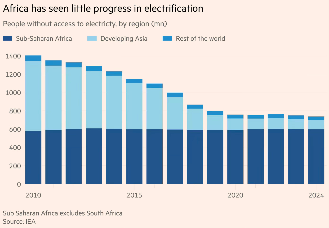 The number of people in Africa without access to electricity remains at 600 million, unchanged from 15 years ago. Among those without electricity globally, the share of Africans has risen from a third in 2010 to 80% in 2024.