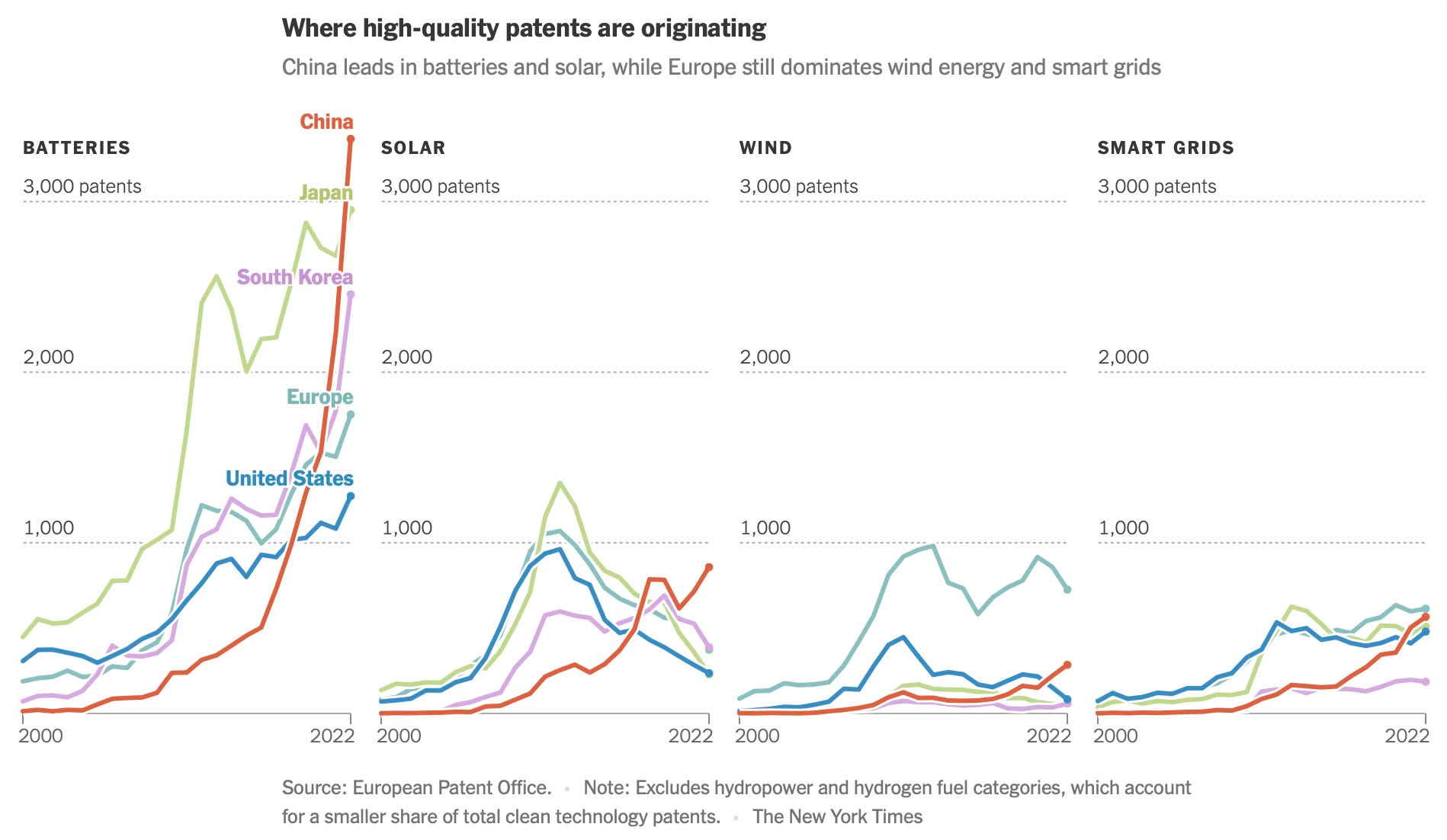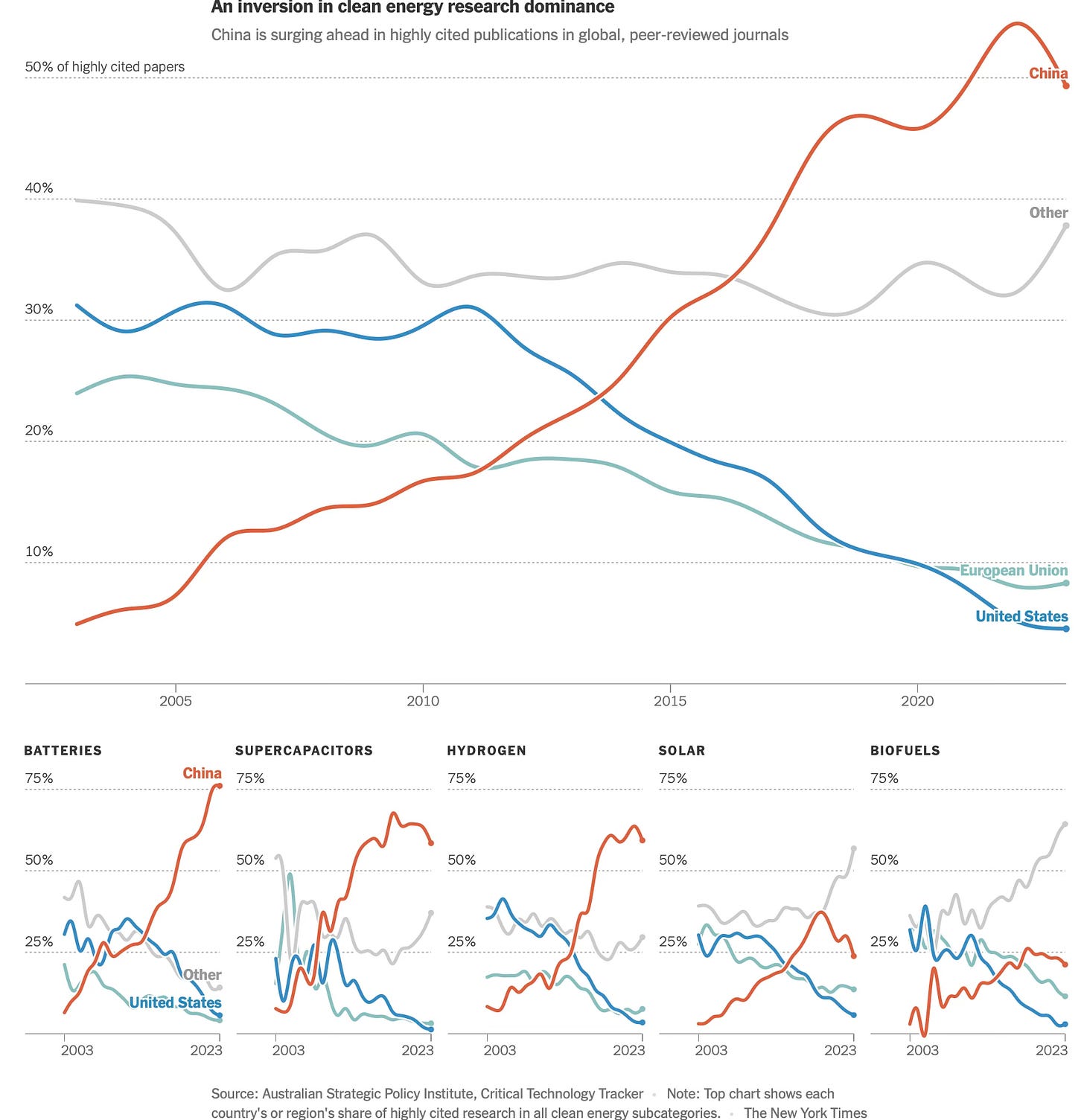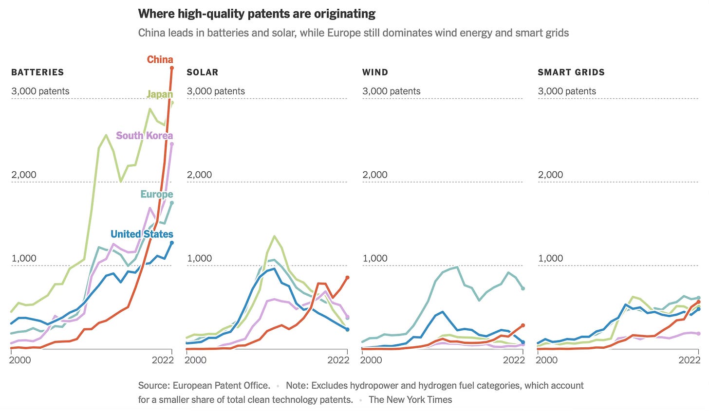 While Western countries like the United States and Australia pioneered now-widespread technologies like solar panels, batteries and supercapacitors (which are like batteries, only smaller, and provide quick bursts of energy), China is now building on those designs and creating new, groundbreaking versions… The Chinese government has encouraged cutthroat domestic competition that some economists have likened to “economic Darwinism.” Sam Adham, head of battery materials at CRU Group, a market analysis company, described a typical scenario: First comes a flood of subsidies into a particular industry that the government has deemed strategic. Companies pile in, filing dozens or even hundreds of patents along the way. In the final stage, Mr. Adham said, the government pulls the subsidies and the less competitive companies essentially are “culled,” while “the remaining companies emerge stronger and they go overseas and take market share there.”…