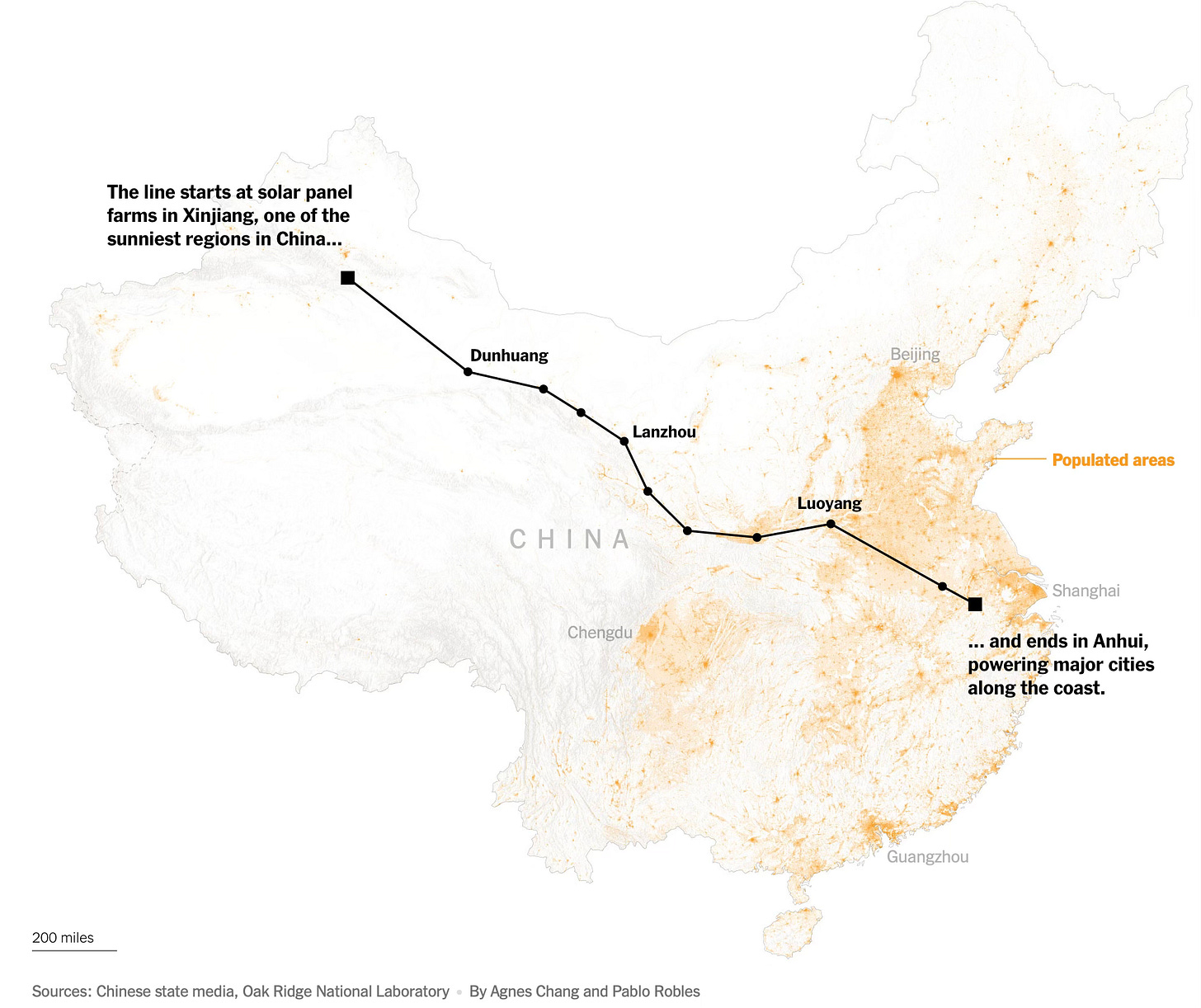 Another NYT long read describes how China is building ultra-high voltage electricity transmission lines to transport renewable power from its deserted, sunny, and windy north and western regions with their roaring rivers to the cloudy and windless load centres in the east with its sluggish rivers, where 90% of its people lives and which hosts most of the factories. One UHV line stretches 2000 km.