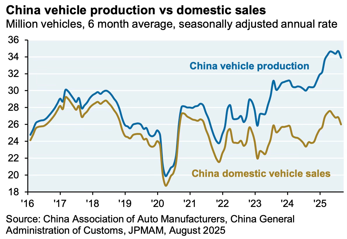 A few graphics from JP Morgan that reiterate these trends. Nowhere is excess capacity more pronounced than in the automotive industry.