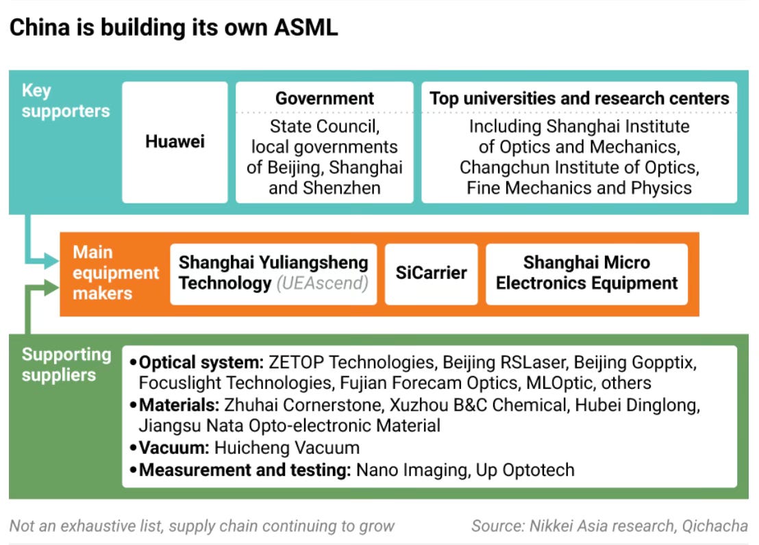 Nikkei Asian Review has an excellent article on China’s attempts to master lithography techniques to make its version of ASML’s DUV machines. Chinese chip manufacturers like SMIC have succeeded in making tools used for etching, measurements, deposition, chemical polishing and more, but struggled with making the lithography machine.