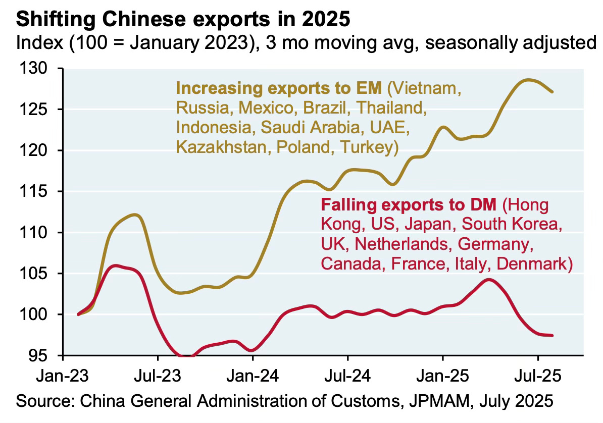 2. As trade tensions rise and the Cold War intensifies, Chinese exports to Western markets have been declining, and have been offset by a steep rise in exports to the emerging markets.