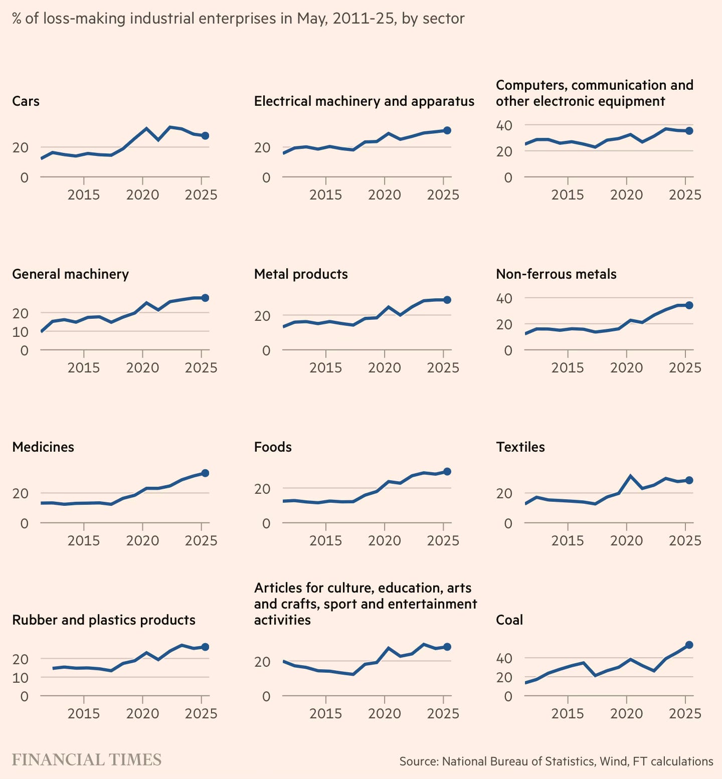 Three graphics that capture the problems posed by China’s manufacturing addiction and the accumulated excess capacity. First, the proportion of loss-making firms has been rising across sectors.