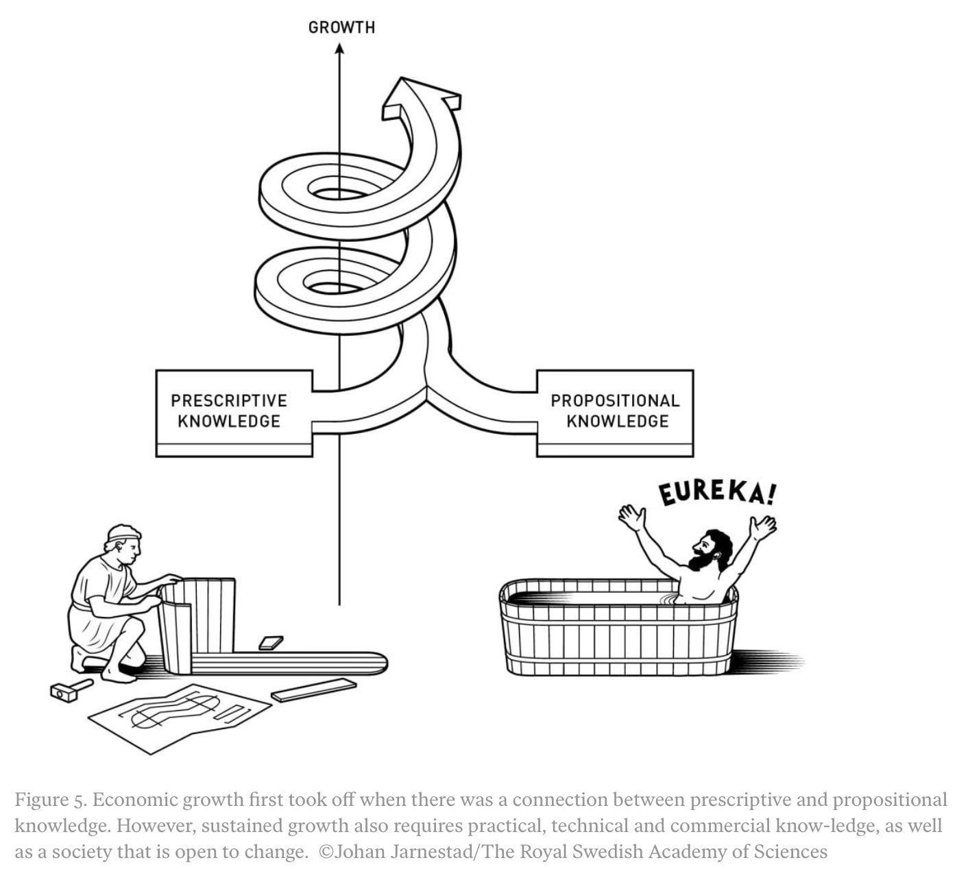 He uses the concept of useful knowledge to answer this question. He defines useful knowledge as that which promotes material progress. It consists of propositional knowledge (“what”) and prescriptive knowledge (“how”). The former describes the “regularities in the natural world that demonstrate why something works”, whereas the latter consists of “practical instructions, drawings or recipes that describe what is necessary for something to work”. It’s a distinction between people who know things (savants) and who make things (fabricants).