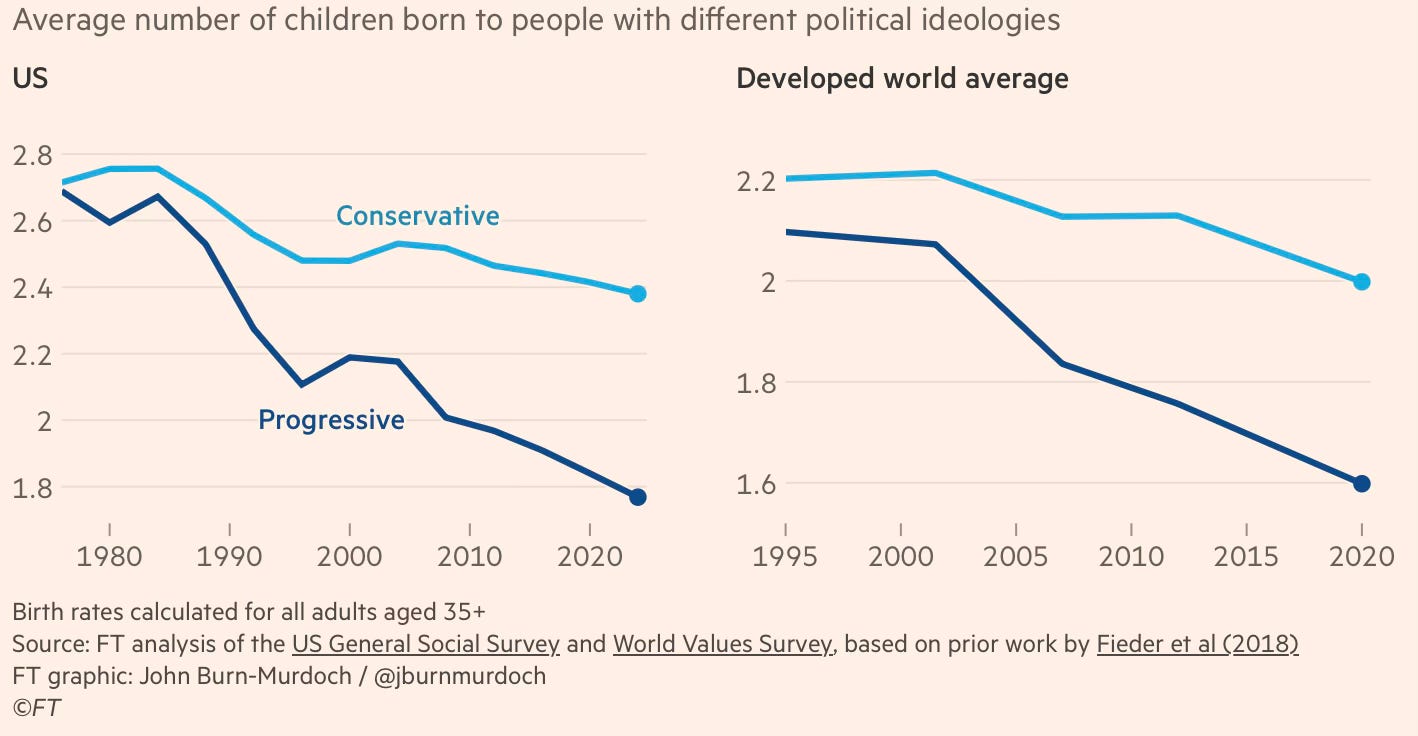 I find that the assumption that birth rates are falling across society in general is not really true. From the US to Europe and beyond, people who identify as conservative are having almost as many children as they were decades ago. The decline is overwhelmingly among those on the progressive left, in effect nudging each successive generation’s politics further to the right than they would otherwise have been… A growing left-right birth rate gap will slow that liberalising conveyor belt, and could result in societies and politicians that are less liberal and less concerned with the environment than would otherwise be the case.
