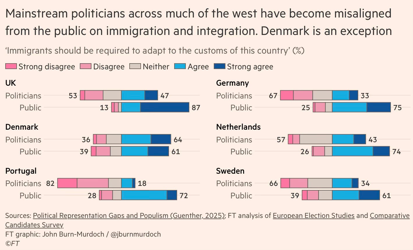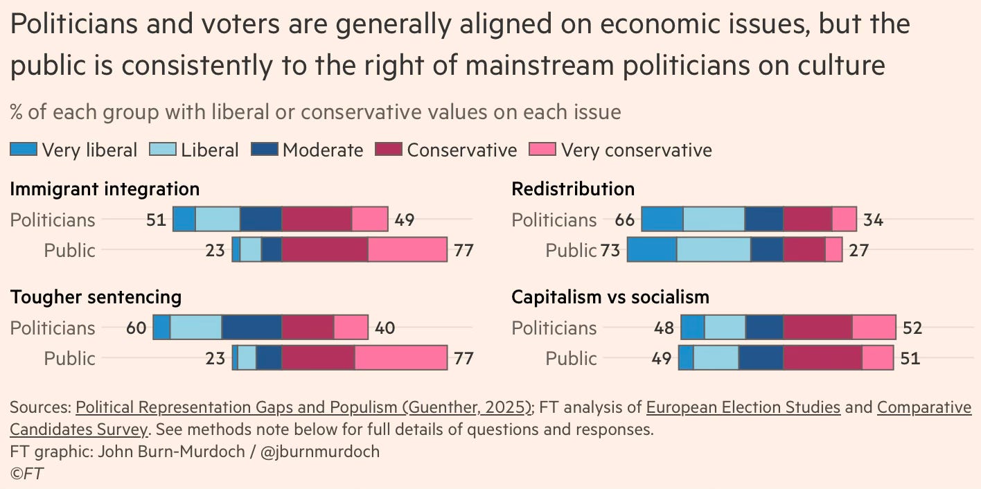John Burn-Murdoch has an excellent op-ed that compares the views of politicians and voters in Western countries on economic and sociocultural issues. He cites the work of political economist Laurenz Guenther, who draws attention to a remarkable convergence on the former and divergence on the latter.