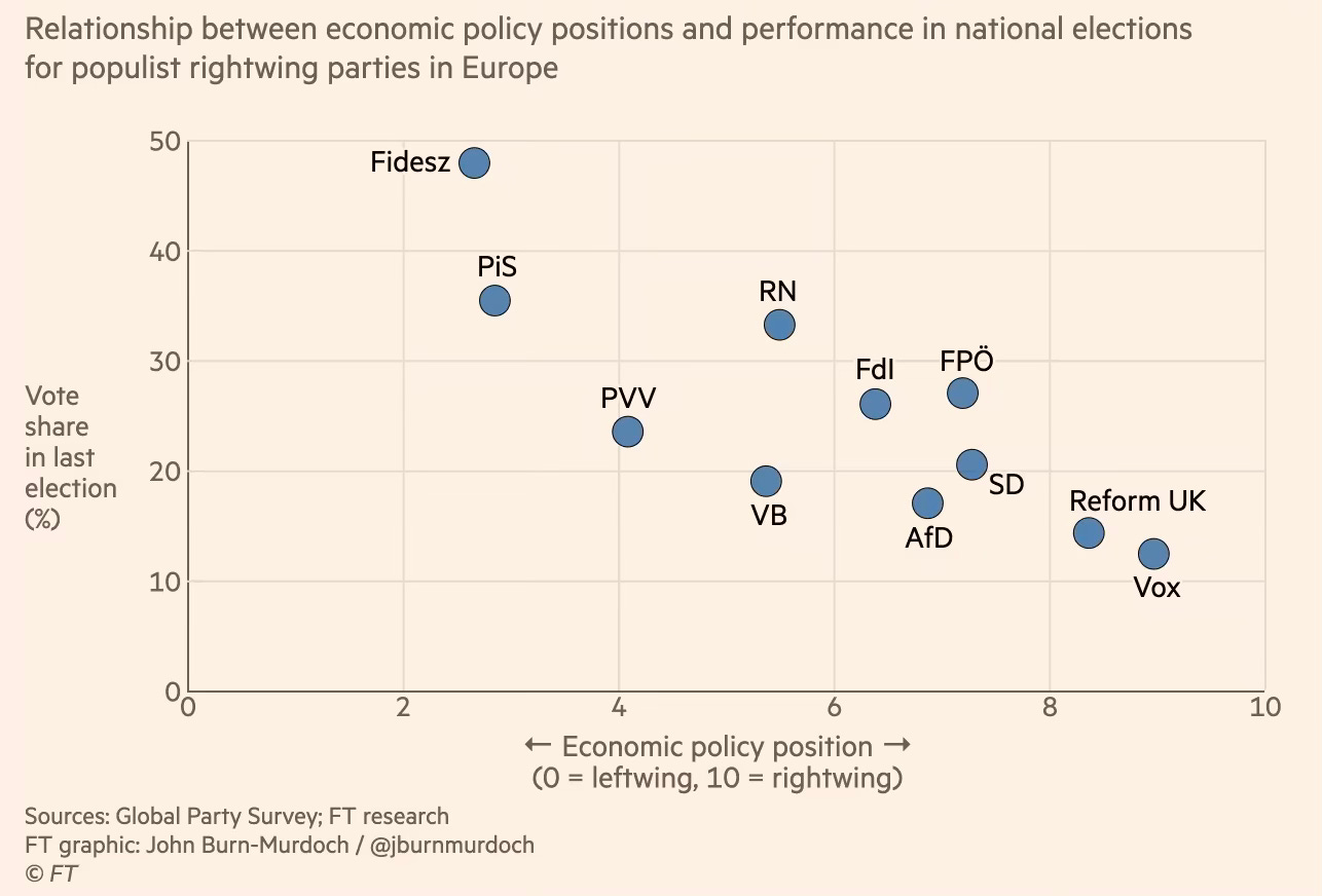 In another article, Burn-Murdoch has shown how “populist parties on the right combine rightwing positions on social issues with left-wing positions on economics”.