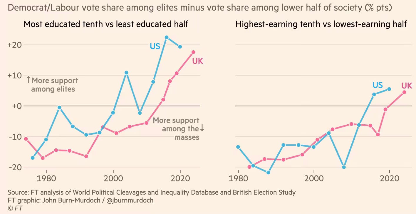 Burn-Murdoch points to the idea that class has been replaced by education as the new defining cleavage in politics.