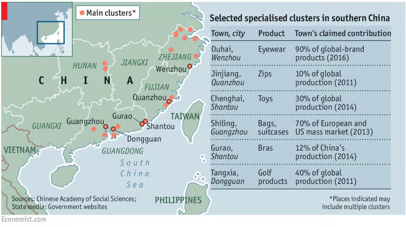 The converse of this phenomenon is China’s vulnerability. China is especially known for the cluster nature of its manufacturing ecosystems, where entire towns are monocultures of specific products. There are more than 500 such specialised towns, with some being responsible for 63% of world’s shoes, 70% of its spectacles, and 90% of its energy saving lamps.