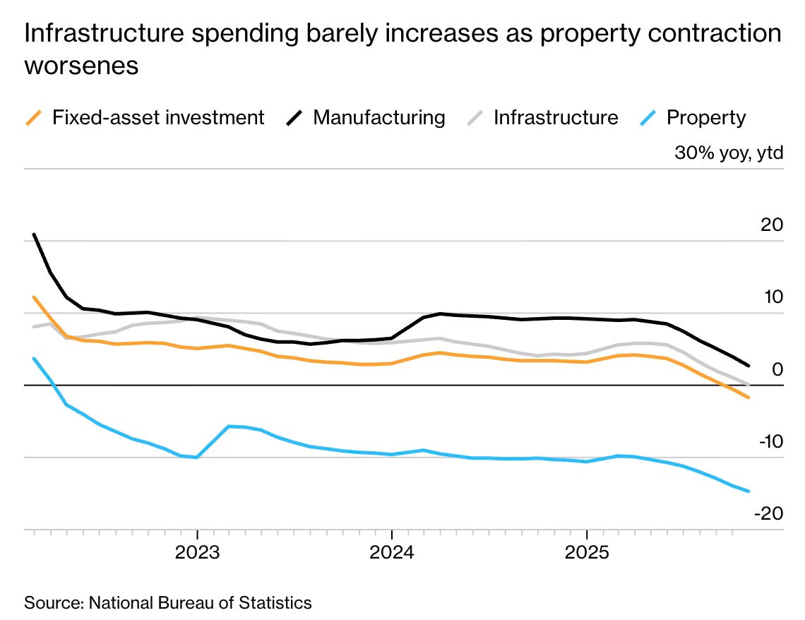 This dynamic comes on top of an investment boom that is clearly flagging slumping. Fixed asset investment shrank a record 1.7% in the first 10 months of the year, with Bloomberg Economics estimating investment dropping by as much as 12% in October, the fifth successive monthly decline.