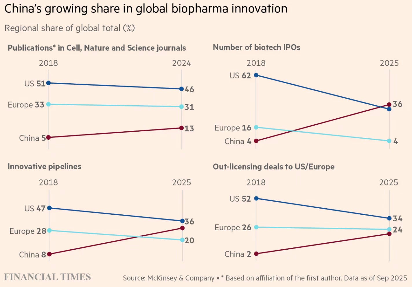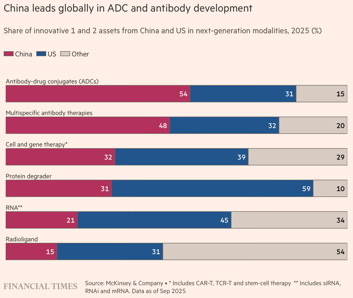 China’s strengths in biotech are concentrated in fields that demand intensive engineering and high-volume laboratory work to iterate and refine new therapies. This is particularly evident in antibody-drug conjugates (ADCs), so-called “biological missiles” that send chemicals directly to tumours, as well as multispecific antibodies, immune proteins that bind to the surface of cancer cells. McKinsey estimates that Chinese companies account for 54 per cent of innovative ADC assets in phase 1 and 2 clinical trials, and 48 per cent of multispecific antibodies… China’s growing capabilities have drawn pharmaceutical multinationals to the country to either buy or co-develop innovative drugs. China’s share of out-licensing deals to the US and Europe has risen from 2 per cent in 2018 to 20 per cent this year… China’s share of new drugs approved by the US Food and Drug Administration — defined as medicines containing active ingredients not previously approved — has risen from 1 per cent in 2018 to 6 per cent so far in 2025, according to McKinsey.