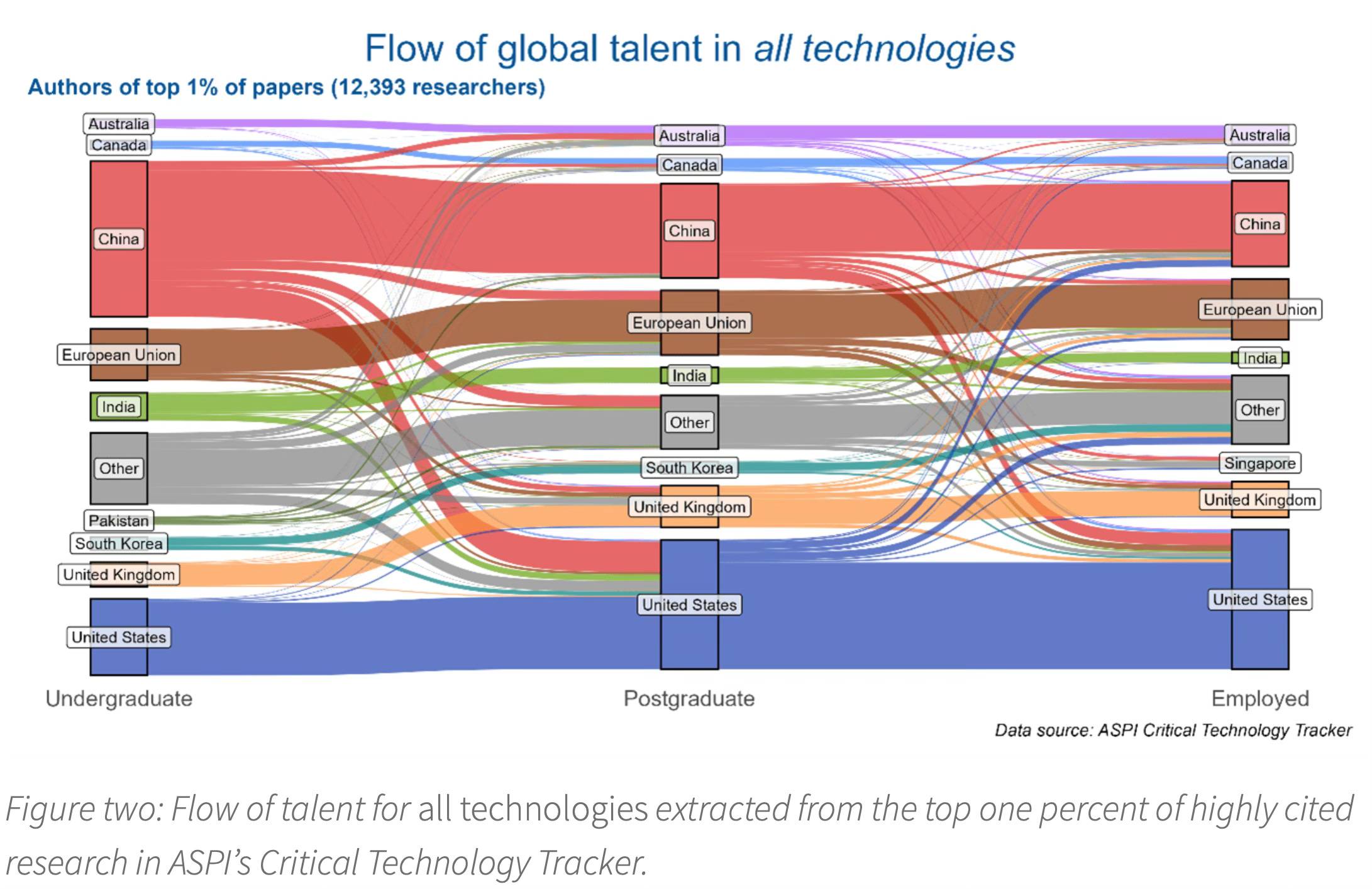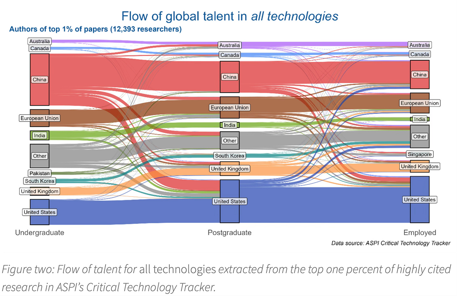 The report also has a Talent Tracker that tracks where authors (for research published between 2020 and 2024) of the top 1 per cent of most highly cited publications are currently working. This shows that the US employs the largest share of top-tier tech talent across both cohorts, with China and the EU following.