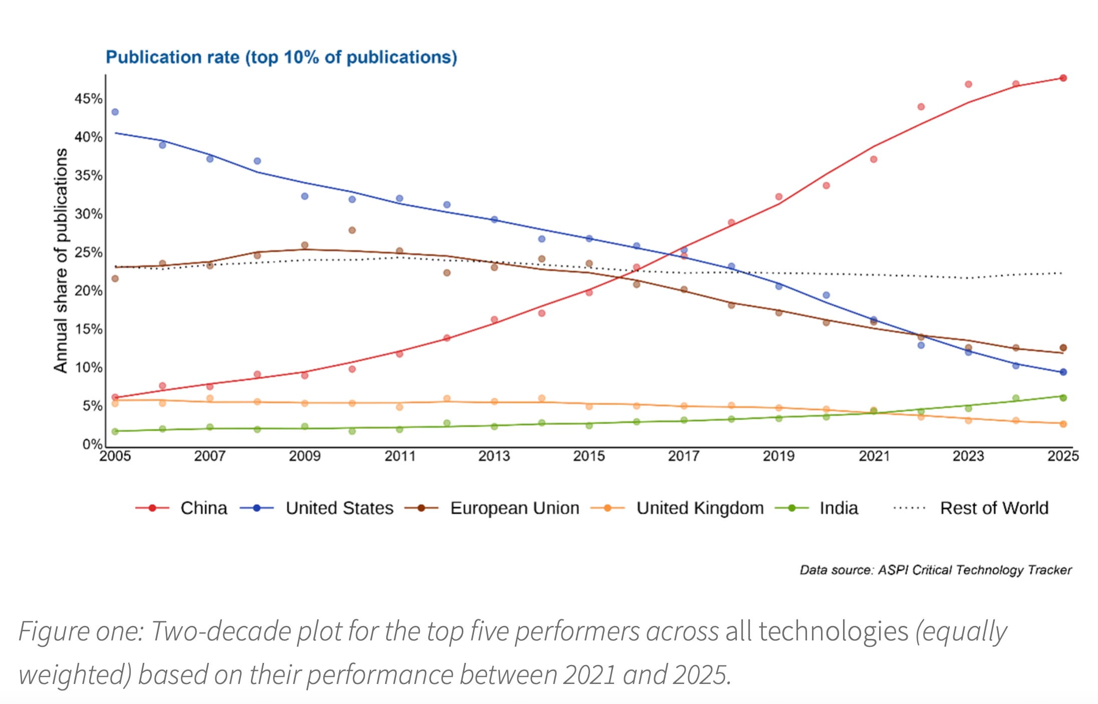The latest annual report of the Australian Strategic Policy Institute (ASPI) covering high-impact global research in 74 technology areas found that China leads in 66 of them, with the US in the rest. The ASPI research, covering 7.7 million unique publications, shows how the US ceded its massive lead in research output in the first decade of the century.