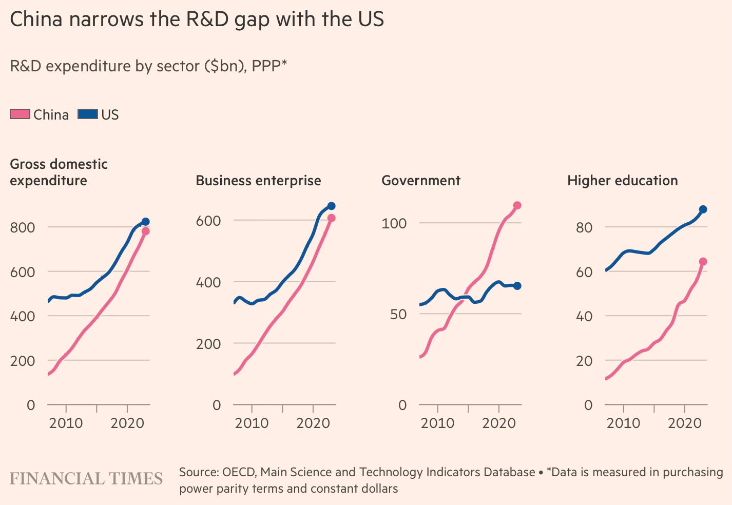 A FT long read points to how China has come to eclipse the US even in R&D and innovation spending, and is rapidly pulling ahead.
