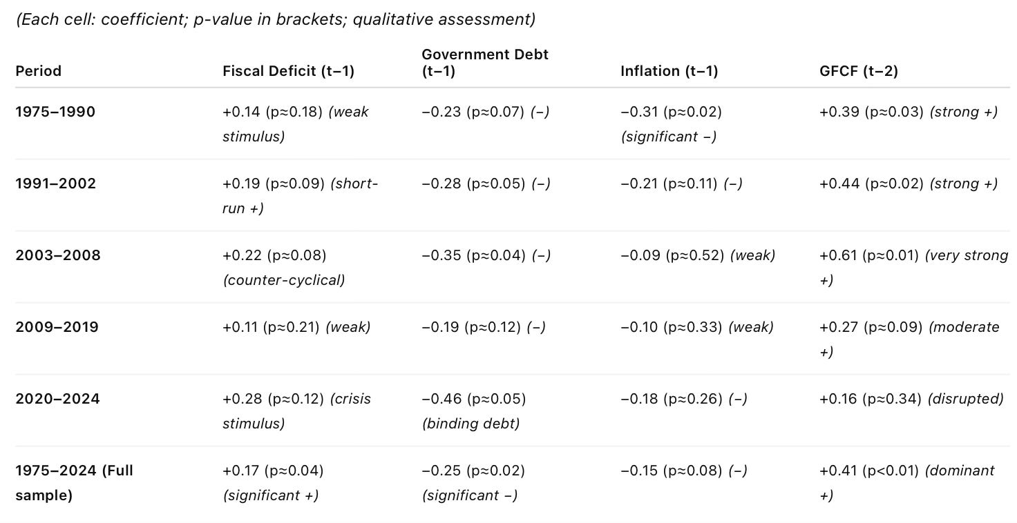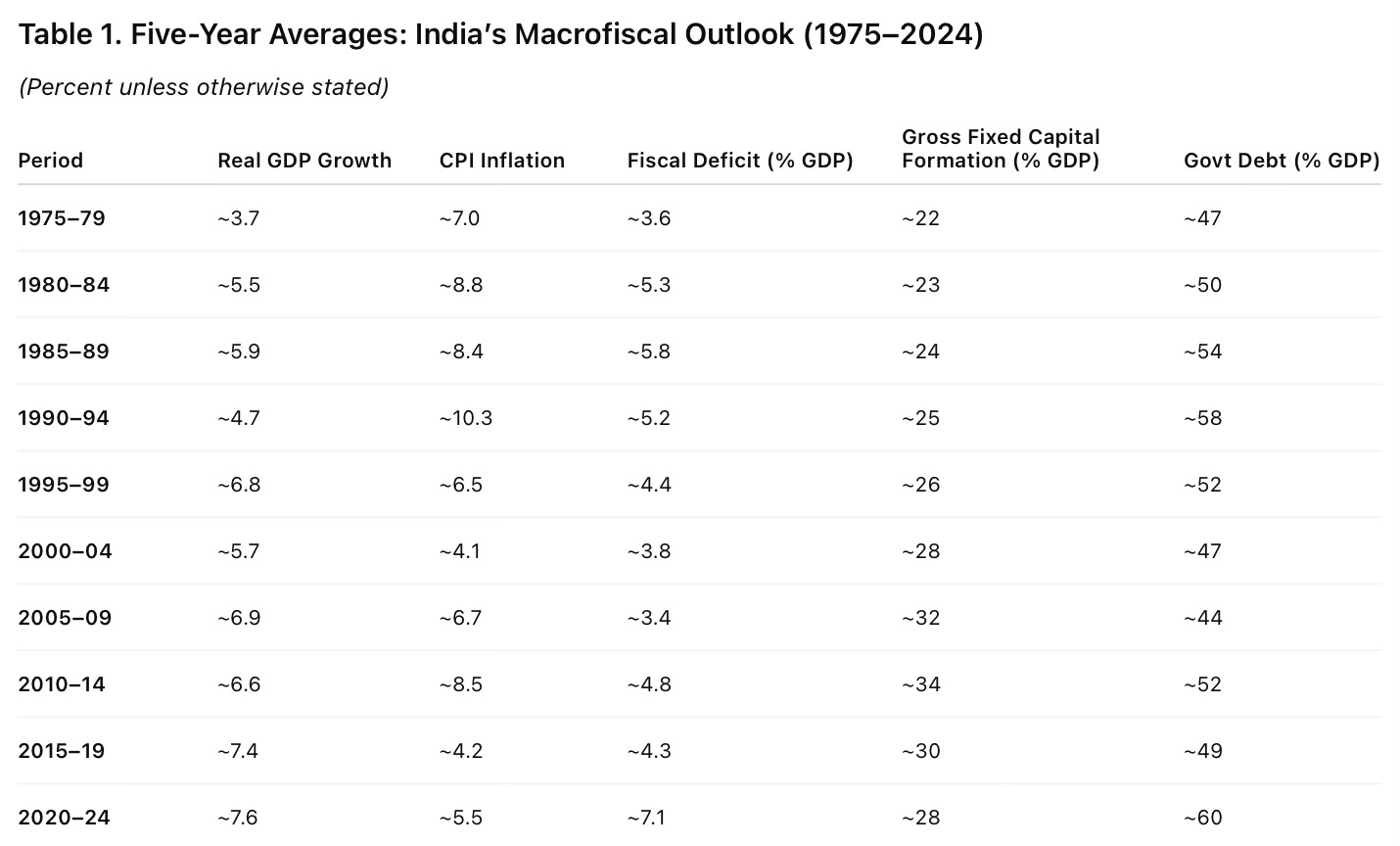 Over the last five decades, India’s growth experience shows no stable linear relationship between fiscal deficits and growth. Periods of high growth have occurred under both fiscal expansion and consolidation. Inflation control appears growth-enhancing primarily in high-inflation regimes, while capital formation is largely pro-cyclical. The results underscore that fiscal quality, institutional credibility, and macro stability matter more than headline fiscal aggregates.