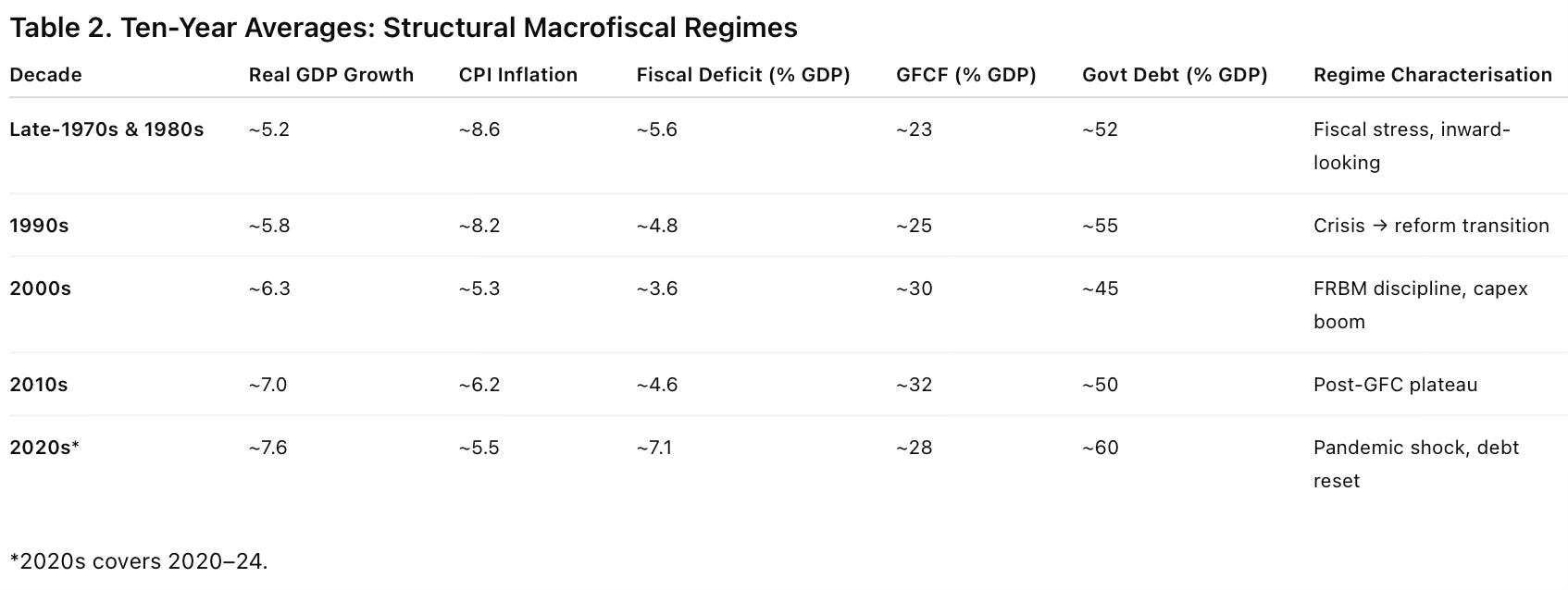 A five- and ten-year view of India’s macrofiscal indicators highlights a clear structural shift after the mid-1990s, marked by lower inflation, higher investment, and improved growth outcomes. The FRBM period stands out as the most balanced macro regime. However, major shocks since 2008—particularly the COVID-19 pandemic—have resulted in persistently higher fiscal deficits and public debt, underscoring the importance of restoring fiscal space while protecting capital expenditure.