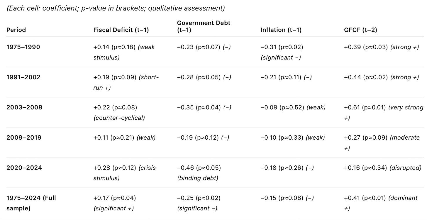 However, if we disaggregate the fifty years into identifiable macroeconomic regimes and perform lagged GDP growth regressions against each parameter separately, the shorter-term trends become less clear and regime-dependent. It provides some useful takeaways.