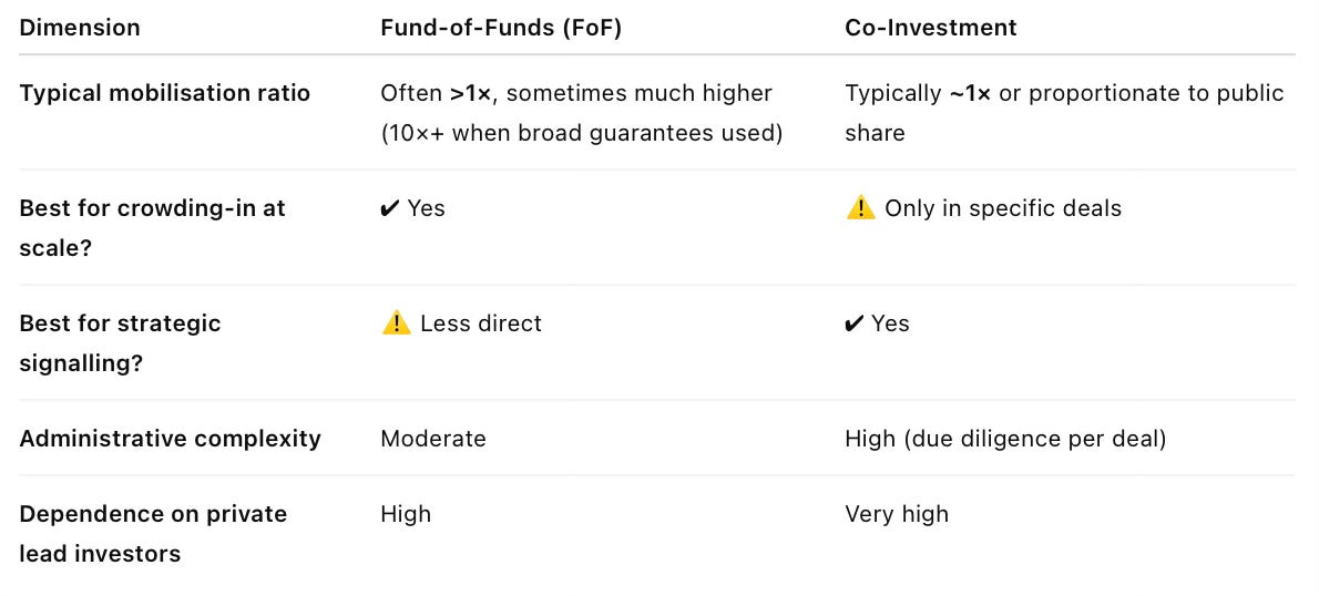 Clearly, if the priority is to maximise the volume of private capital mobilisation and to catalyse the VC market, the fund-of-funds approach is superior. However, if the priority is to catalyse a few strategically important firms or technologies where private capital is reluctant, then co-investment is useful.