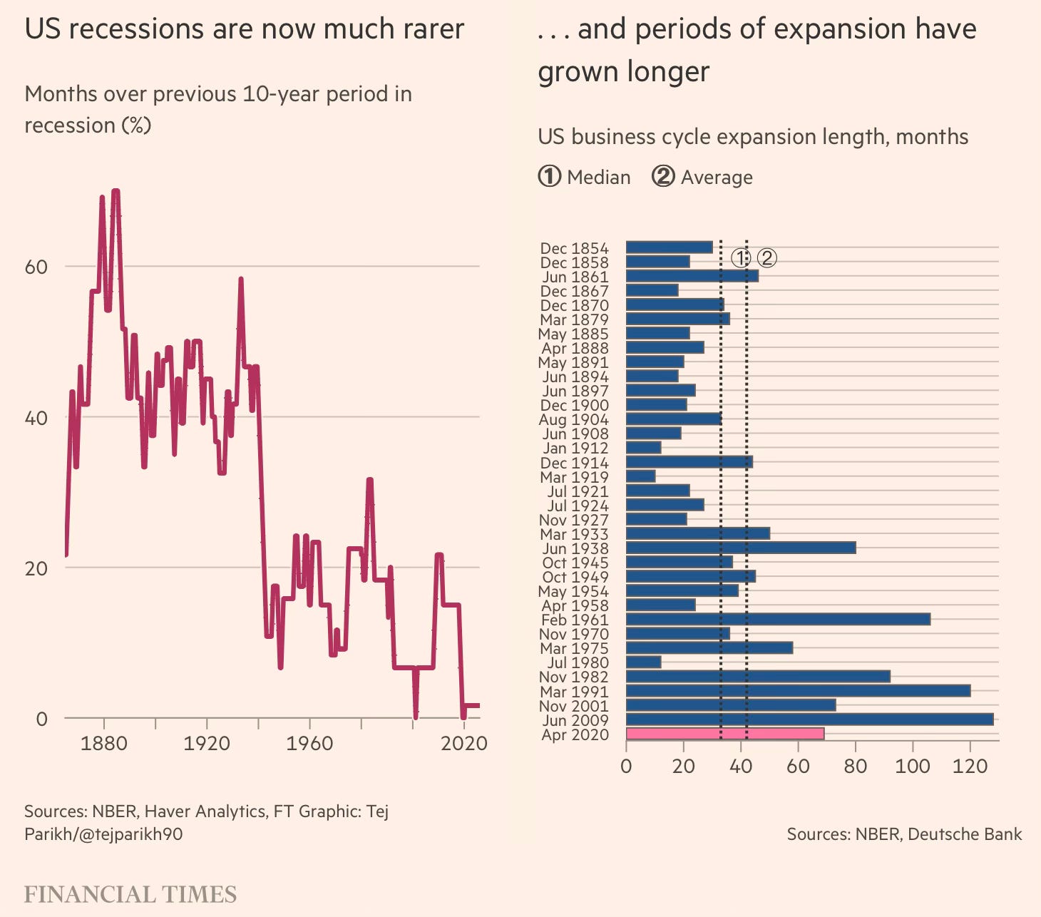 The US has only seen four recessions since 1982. But over the previous 40 years there were nine, and over the 40 years before that there were 10… The US economy was in recession for 58 months over the past five decades compared to 143 in the equivalent period prior, based on data beginning in the 1850s from the National Bureau of Economic Research… The past five cycles of US economic expansion — including the current one that began in the aftermath of the Covid-19 lockdowns — have averaged more than eight years, which is close to triple the average length of cycles before.