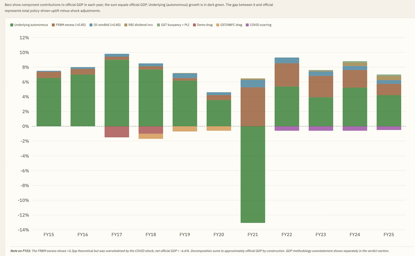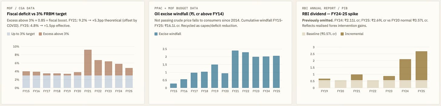 The government clearly benefited from three positive fiscal events: the long period of low oil prices (increased excise tax revenues due to not passing through the reduced oil prices), the surge in RBI dividends, and the large additional fiscal space from discarding the FRBM framework.