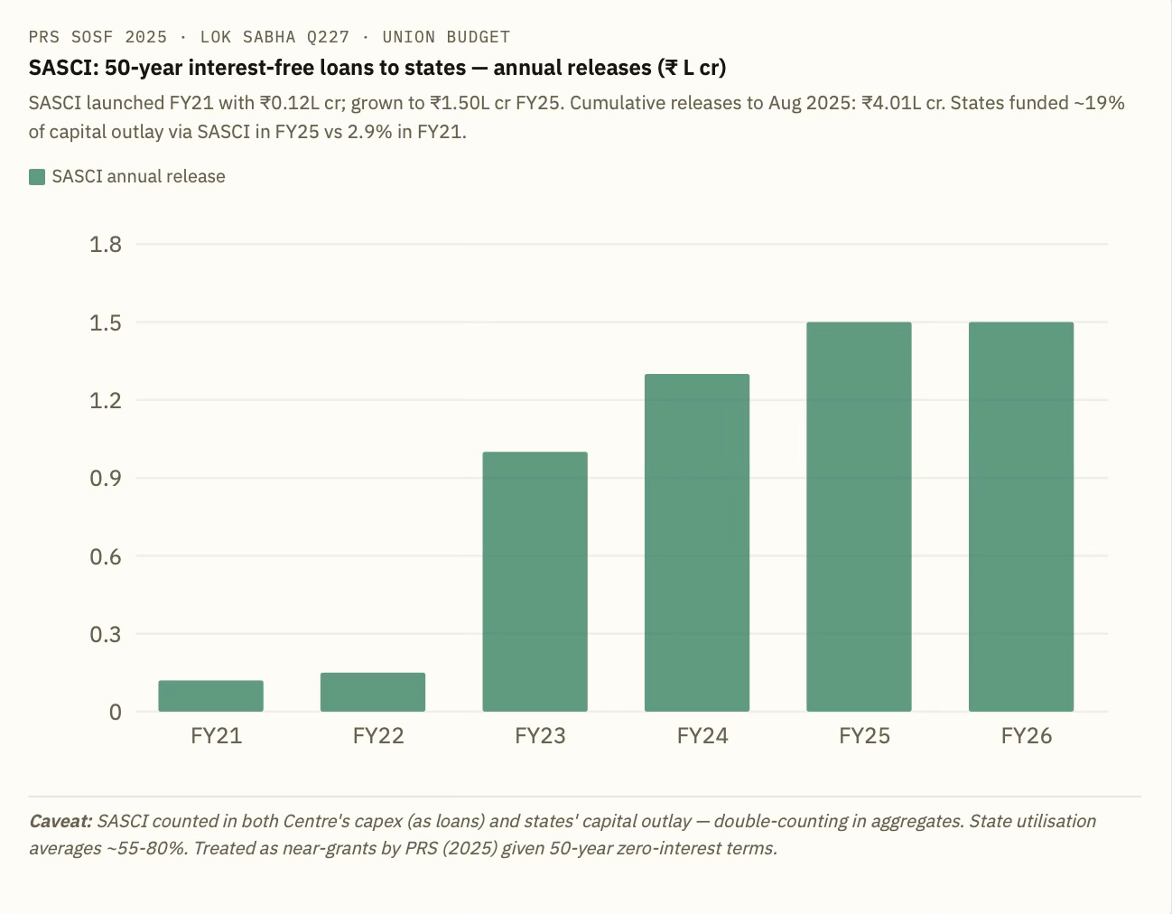 The fifty-year interest-free loan to states under SASCI was a new addition, amounting to about Rs 1.5 lakh Cr each year.