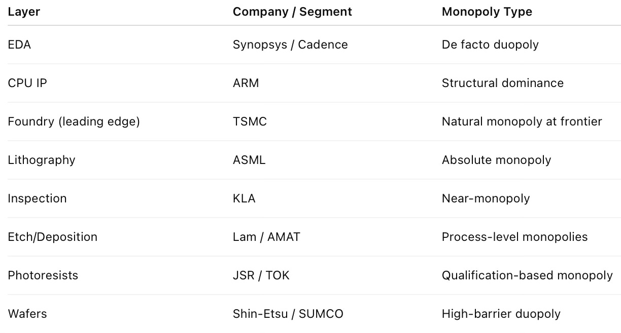 This moat is a result of the structural characteristics of the technology that creates a dynamic natural monopoly, arising from a combination of a long period of co-evolution with suppliers and customers, unmatchable accumulated R&D and tacit knowledge, high capital intensity and irreversibility (once invested, exit is costly and entry is irrational), and very long time horizons. In fact, the entire semiconductor chip design-to-fabrication value chain, including the equipment used, can be considered a stack of interlocking monopolies.